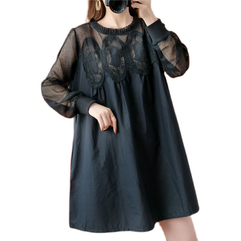 Autumn Clothes plus Size Women's Clothes Loose Hollow Lace Net Yarn Splicing Fat mm Covering Belly Thin Long-Sleeve Dress