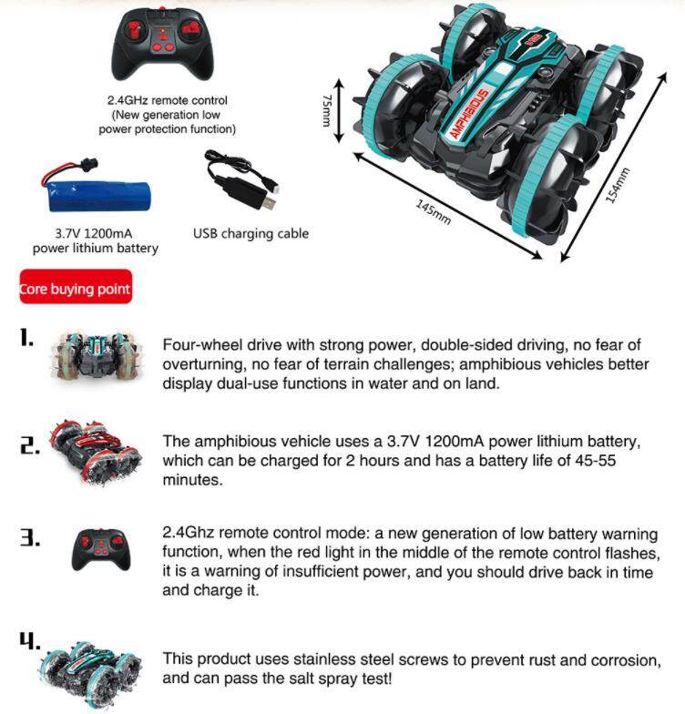 Functions: Forward/Backward,Turn Left/Right, Double-sided Driving, 360° Rotation, Water and Land