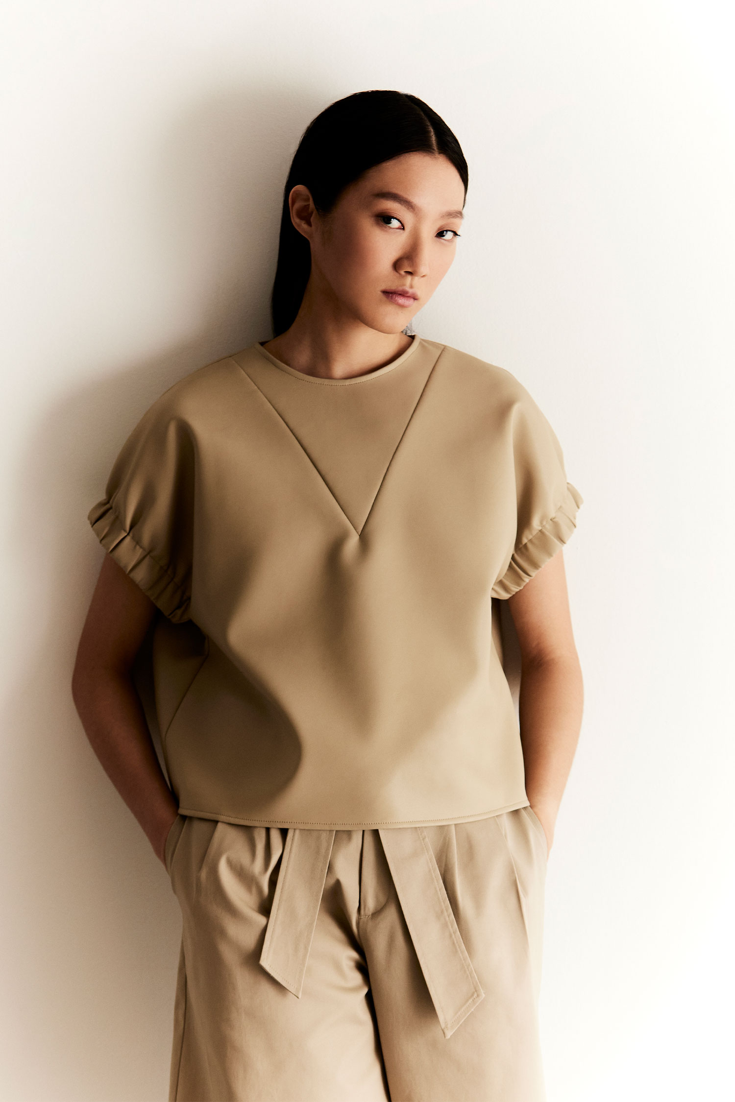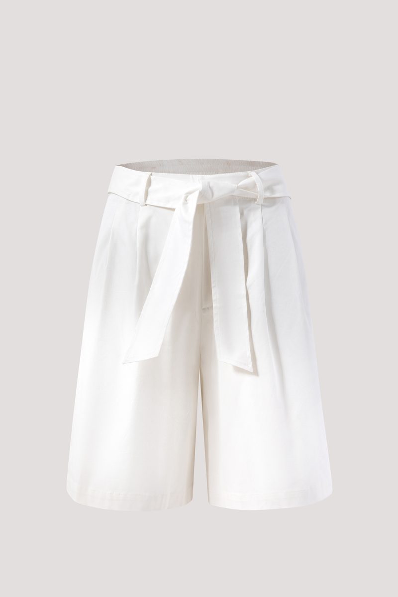 Standard front with button and zipperfly fastening Waist pleats detailing Side pockets Detachable waist sash detailing Back with decorative welt-pockets 97% Cotton, 3% Spandex