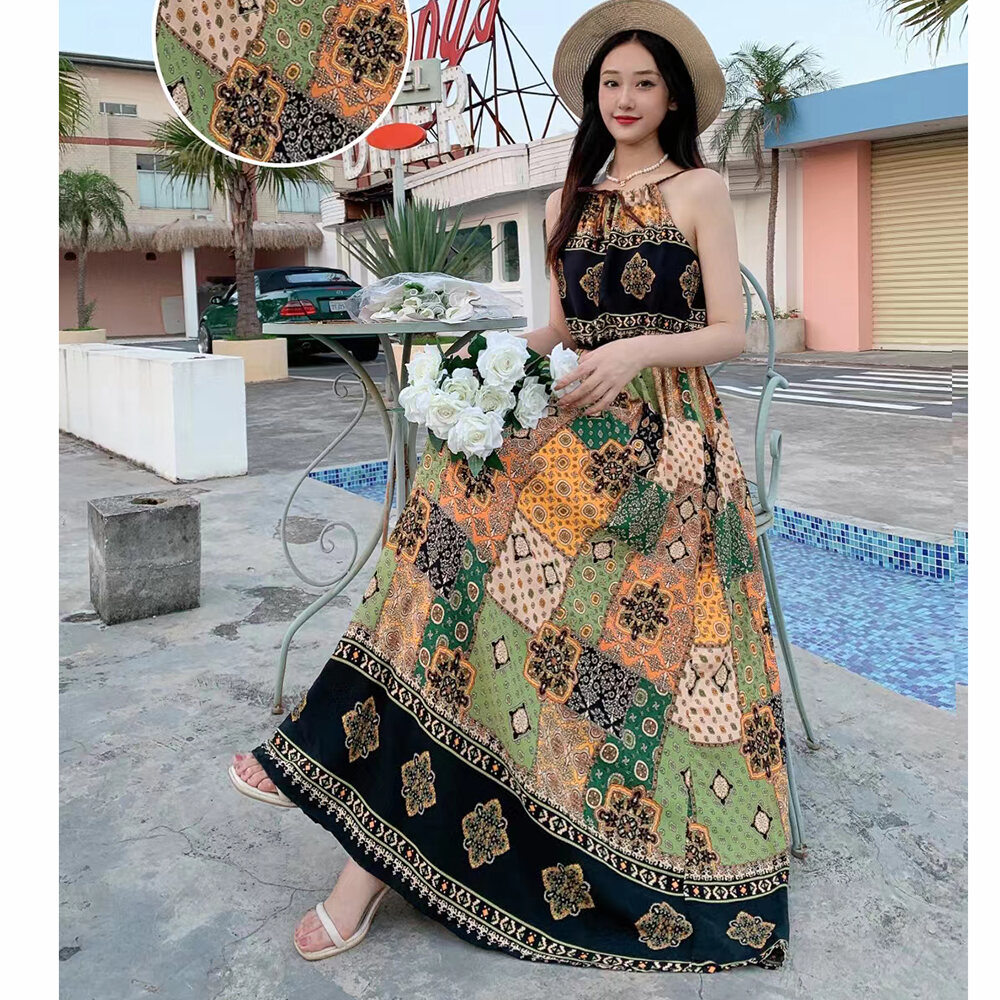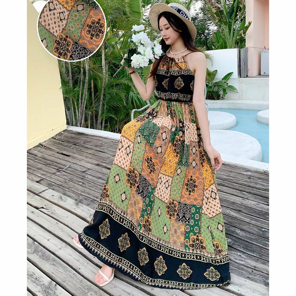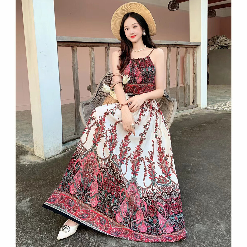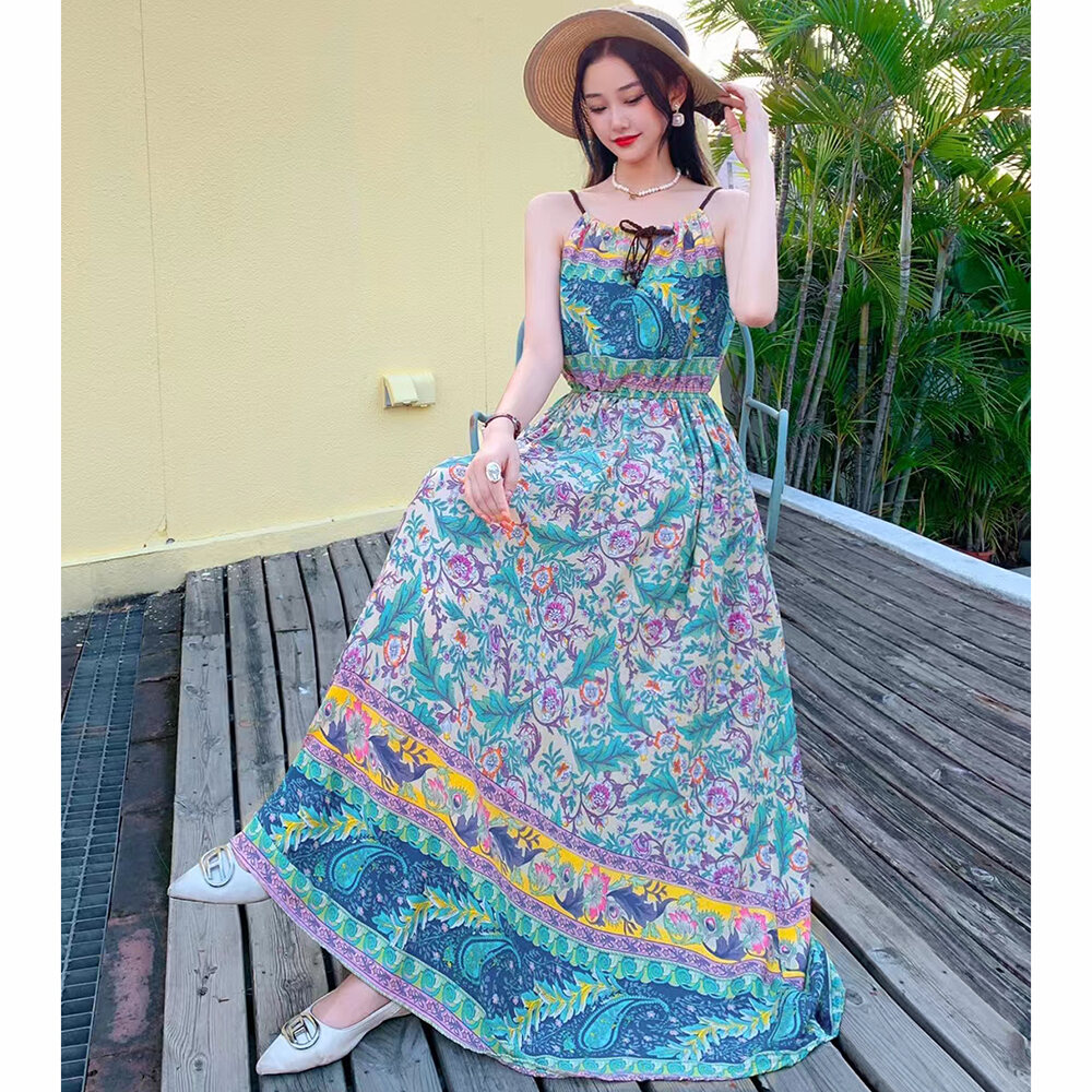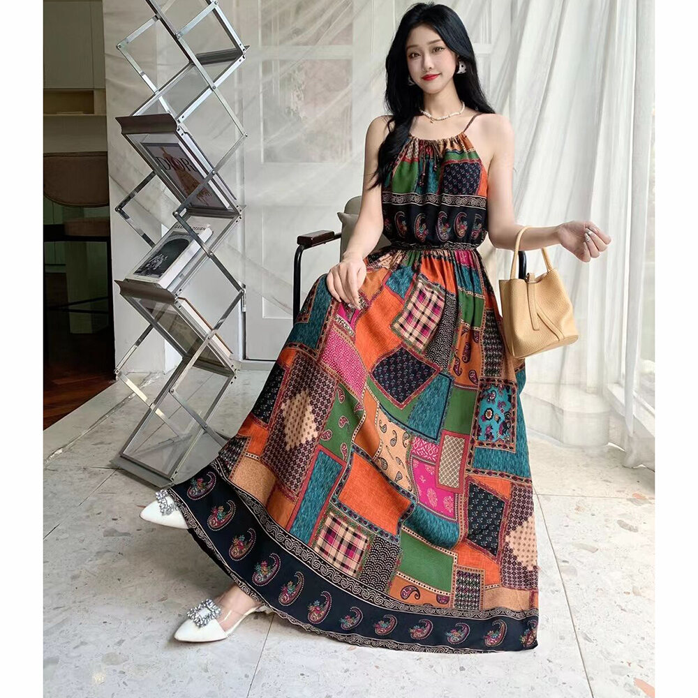 Bohemian Long Dress Cotton Silk Halterneck Suspender Skirt Dress Long Floral Beach Skirt Seaside Holiday High Waist
