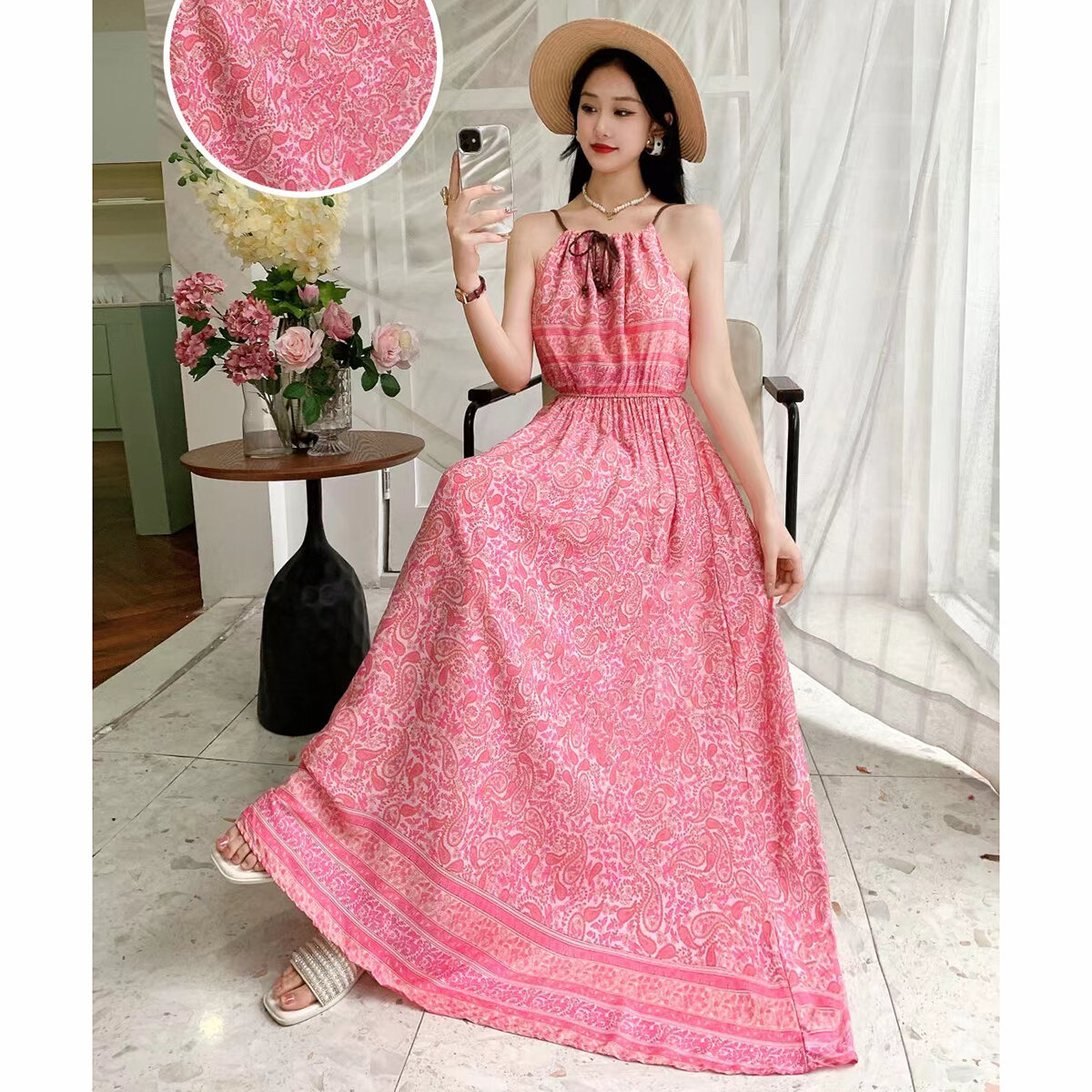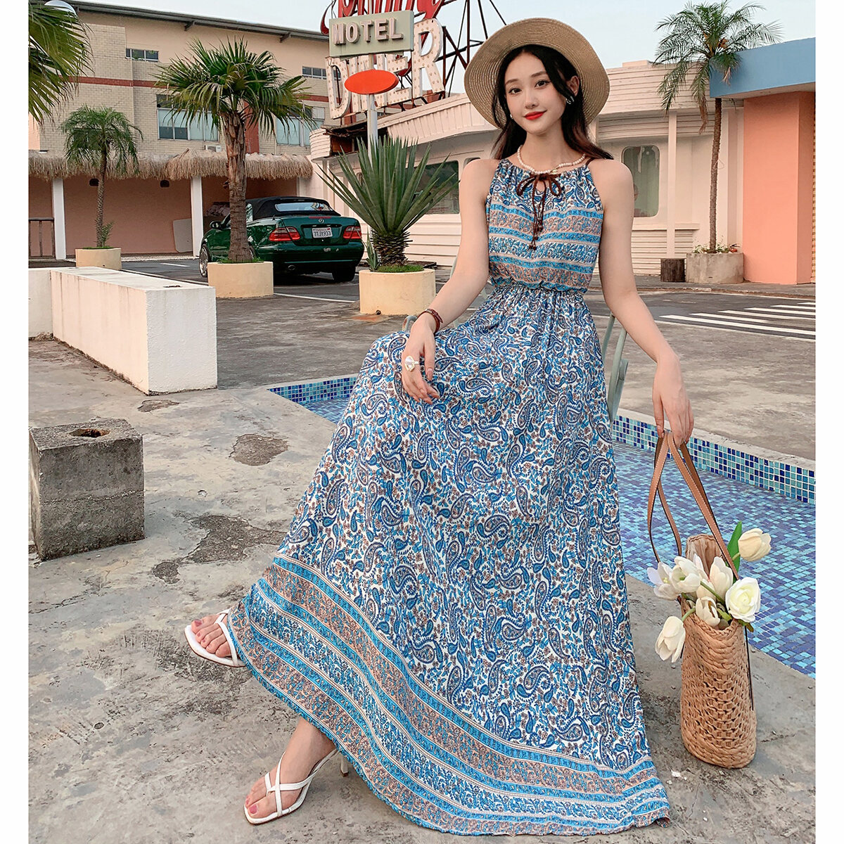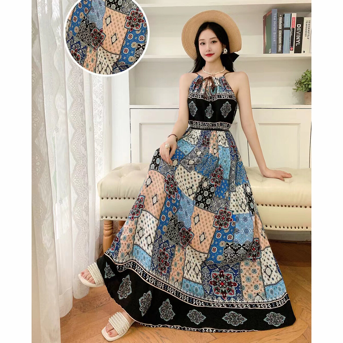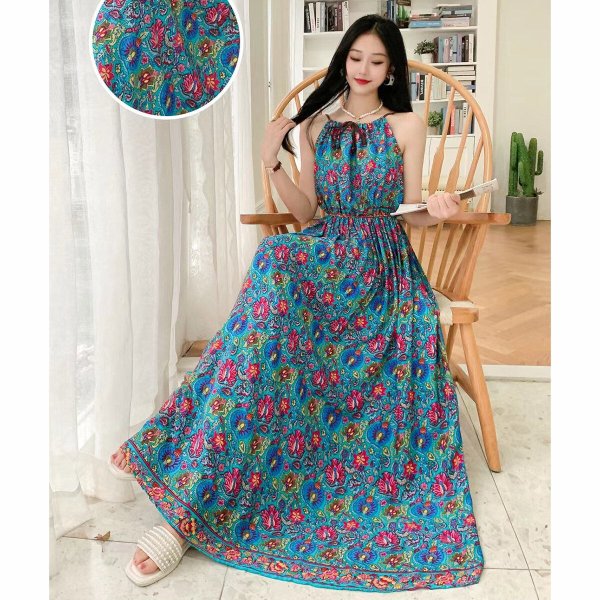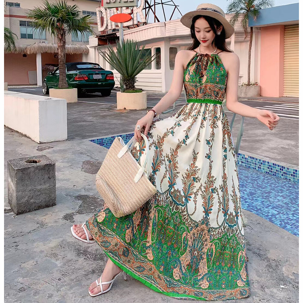 Bohemian Long Dress Cotton Silk Halterneck Suspender Skirt Dress Long Floral Beach Skirt Seaside Holiday High Waist