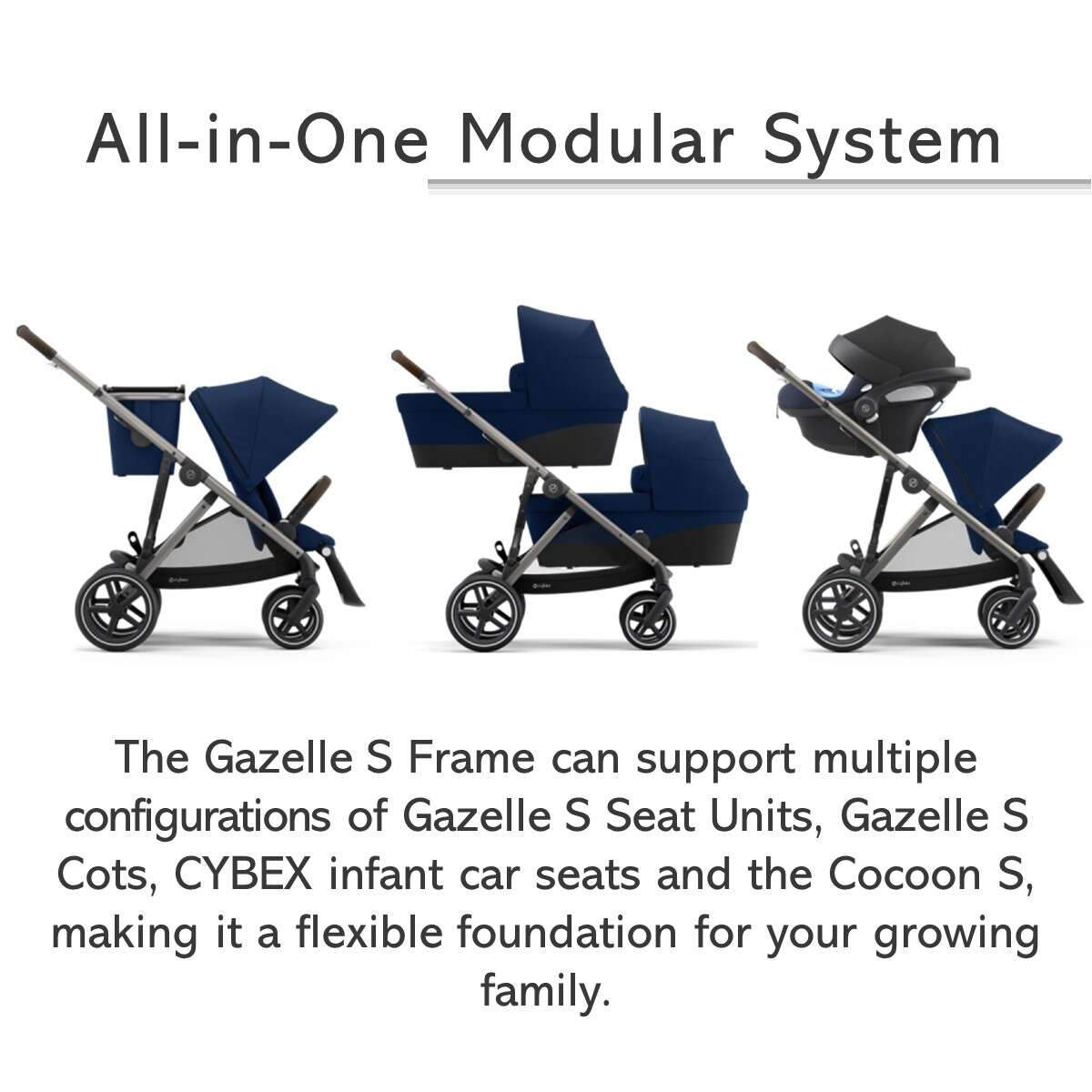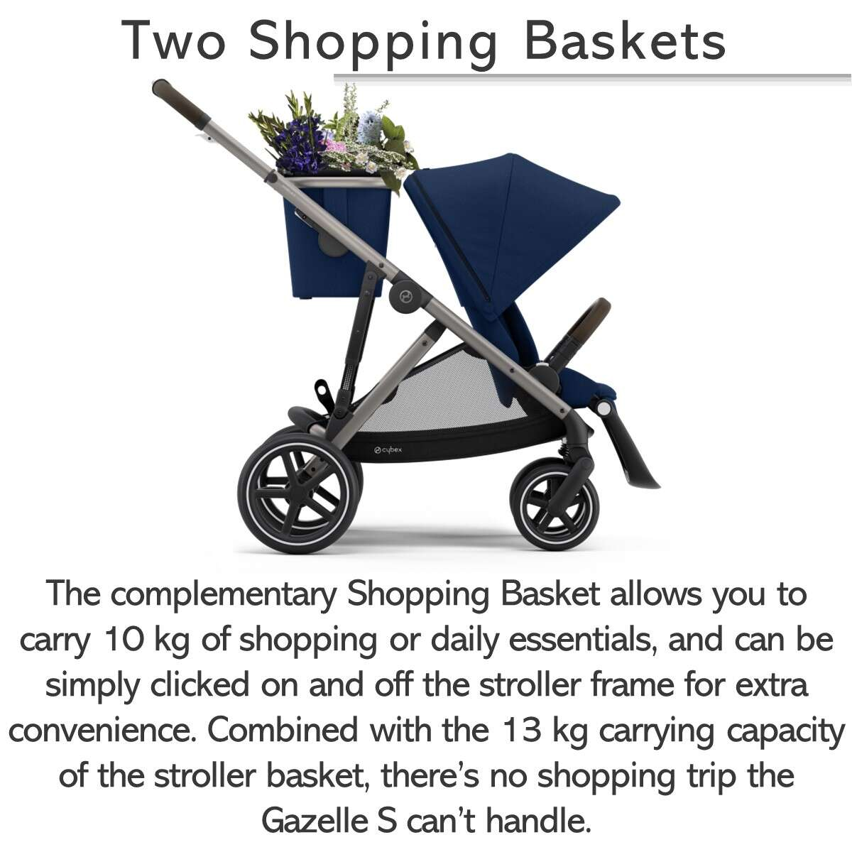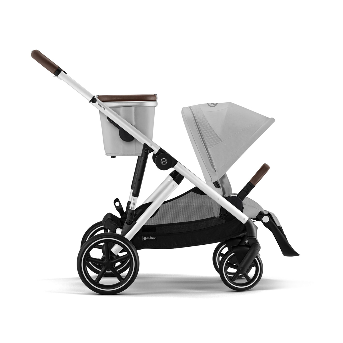 The Gazelle S 2 modular stroller delivers an exceptional ride as a single stroller and adapts easily as a double stroller with more than 20 configurations. Features two large shopping baskets and our unique one-pull harness.