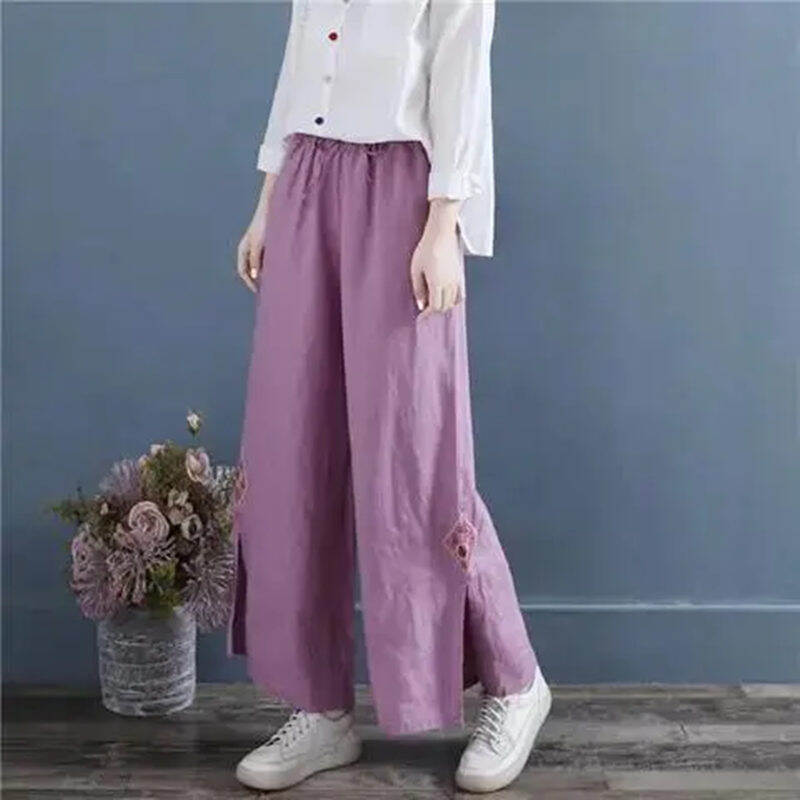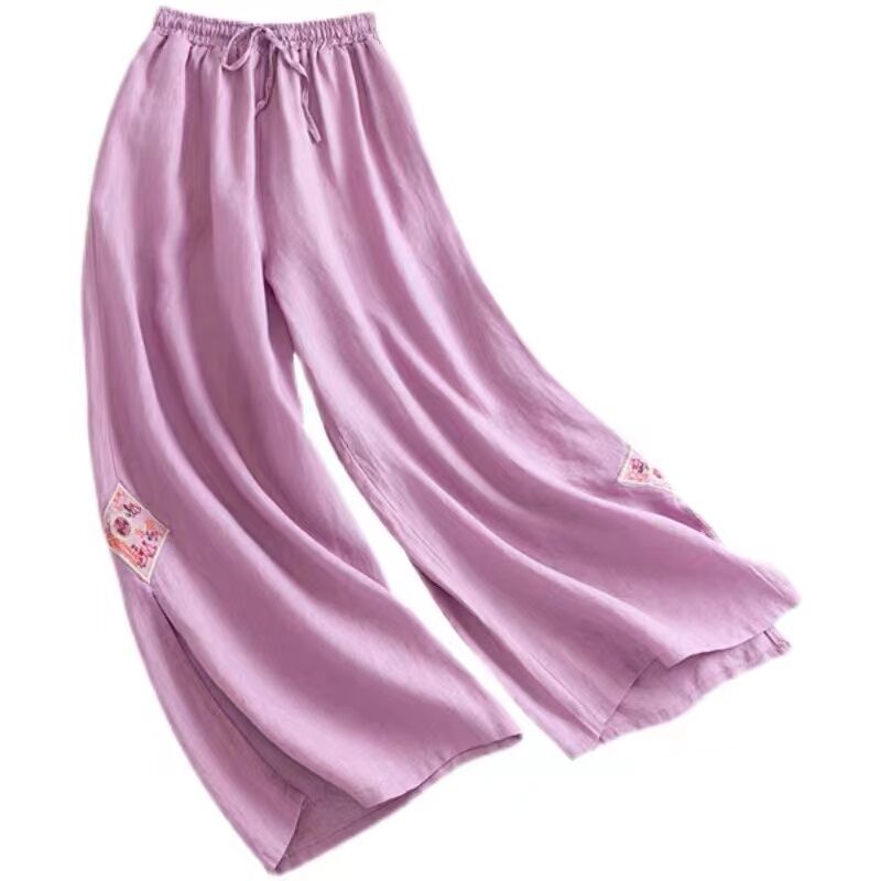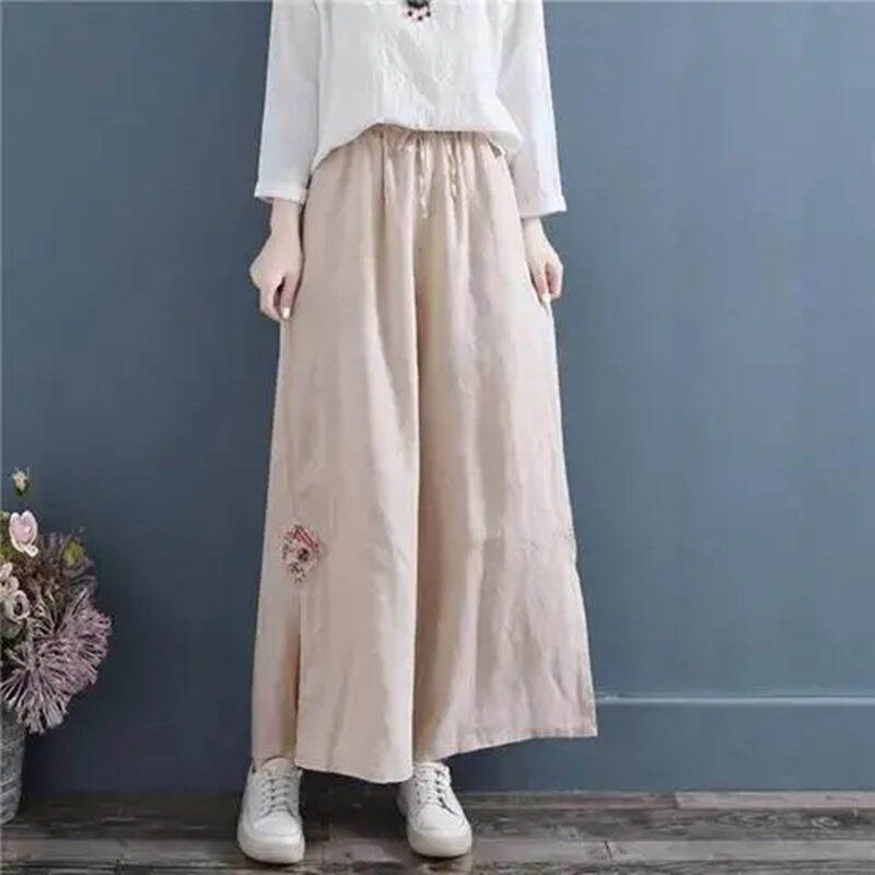Artistic Retro Embroidery Pure Color Split Wide-Leg Pants Women's Elastic Waist Cotton-Linen Casual Loose Ankle-Length Lace-up Long Culottes
