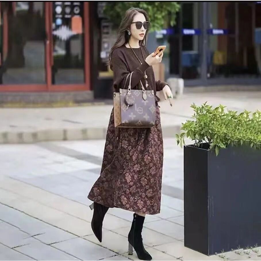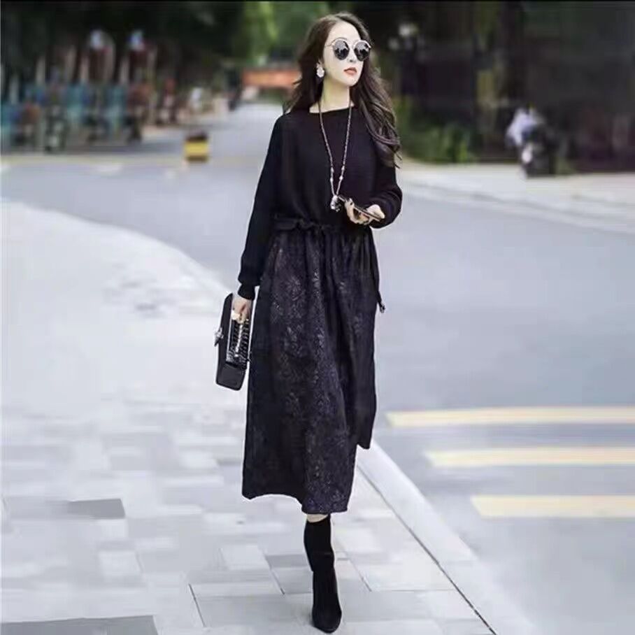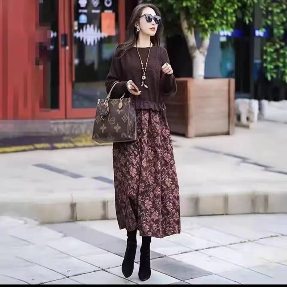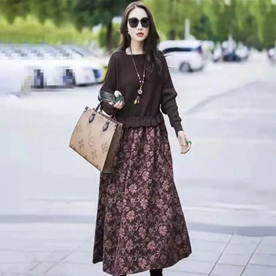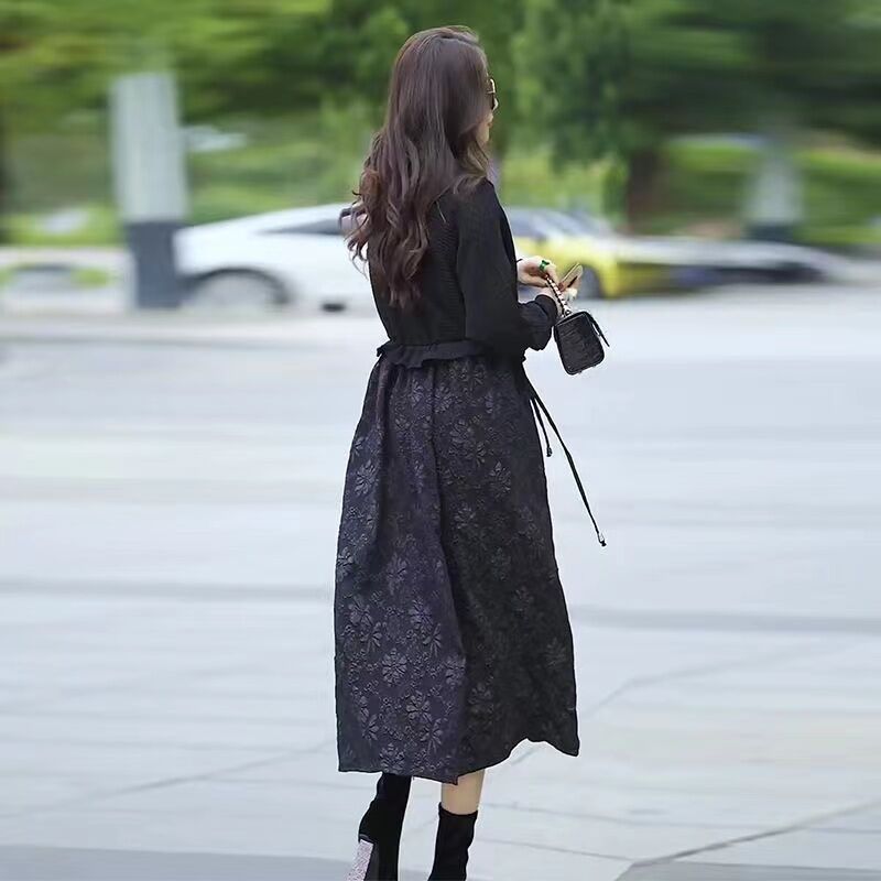 2024 Spring and Autumn New Patchwork Dress Female Slim Looking Loose Fashion Fake Two Pieces Waist Tight Mid-Length Skirt Tide