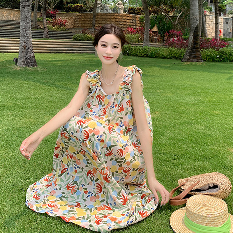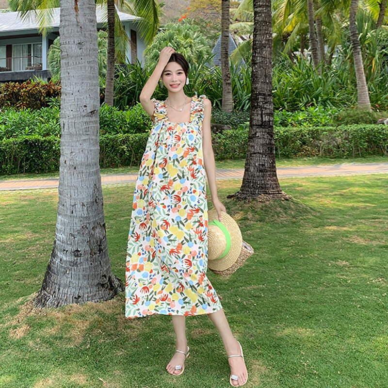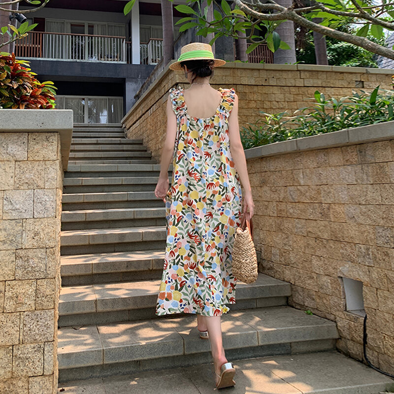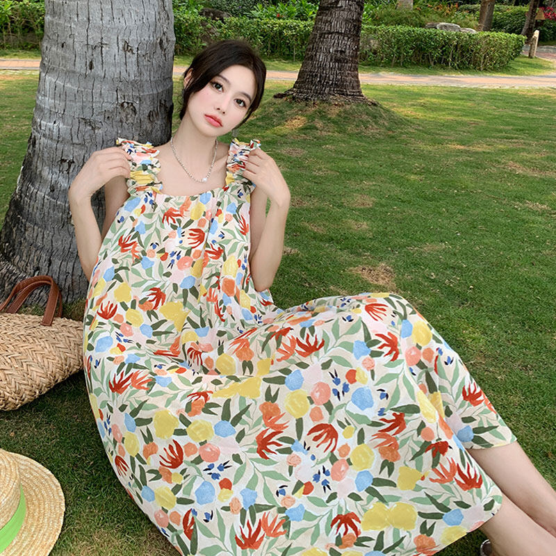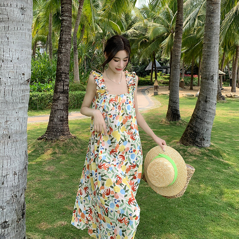 Dali Erhai Photography Skirt Vacation Style French Floral Print Width Spaghetti-Strap Strap Dress Sanya Seaside Beach Skirt