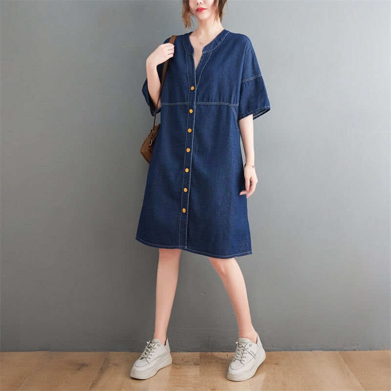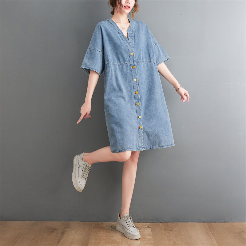 Summer New Arrival Dress Plus Size Ladies Stylish Drawstring Denim Shirt Artsy Outwear Plus Size Short Sleeve Cardigan A- line Skirt