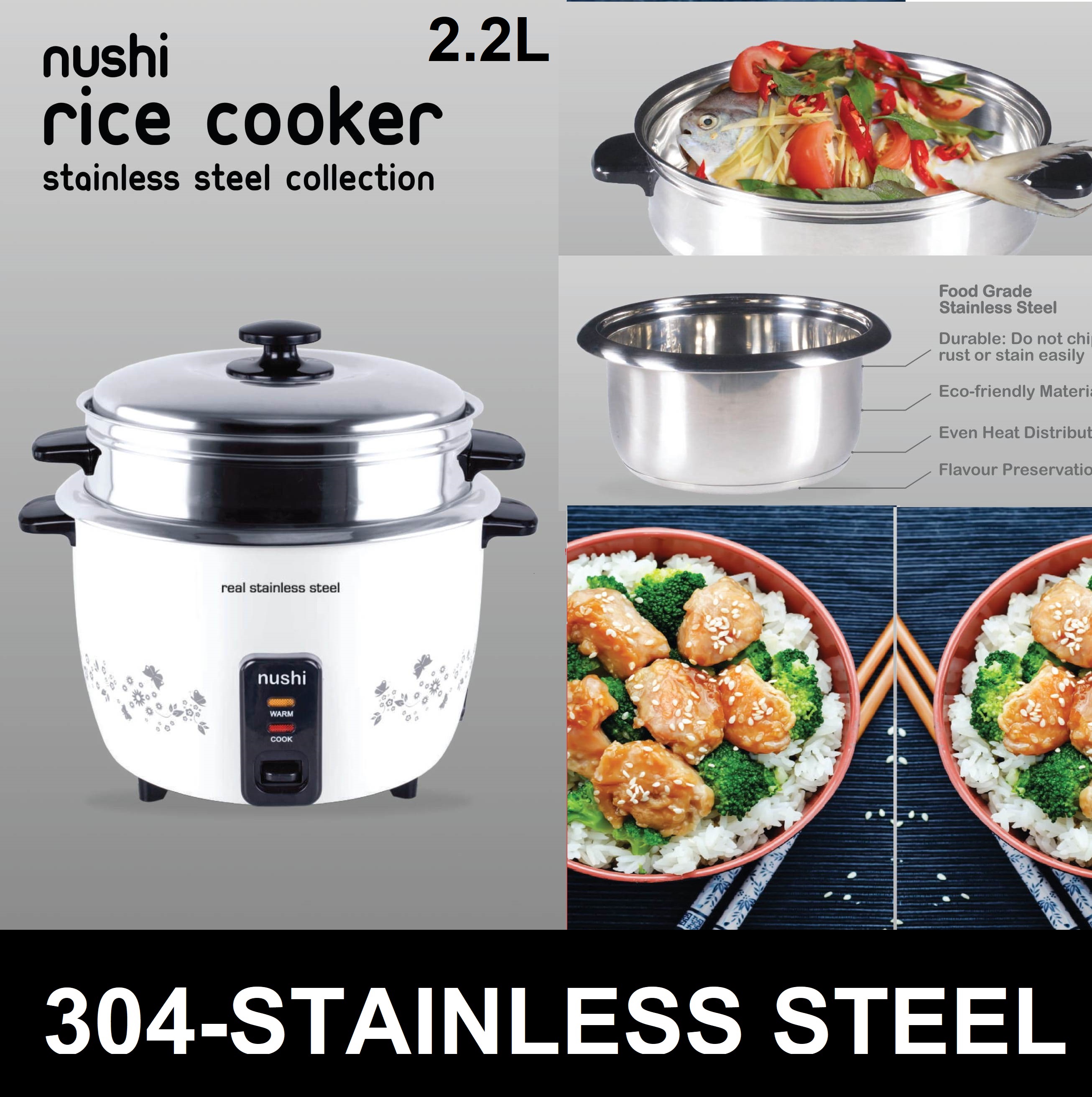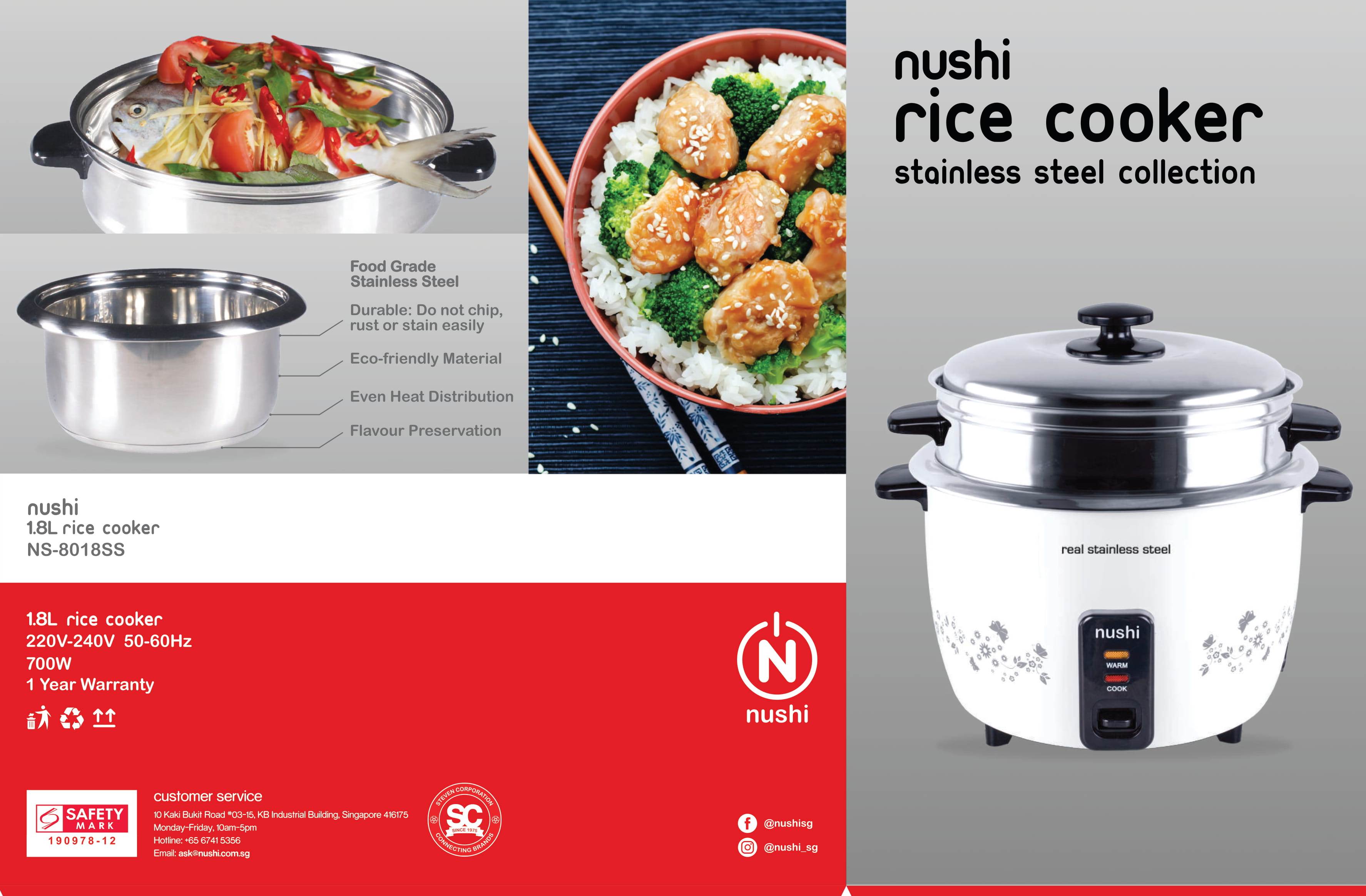 【HEALTHY CHOICE】NUSHI STAINLESS STEEL RICE COOKER WITH STEAMER 1.8 L / 2.2 L 【ONE YEAR WARRANTY】