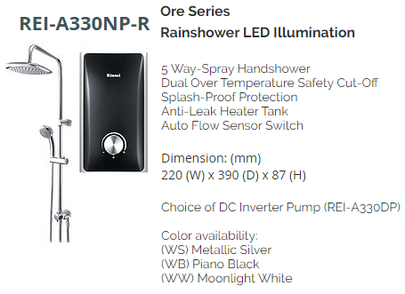 RINNAI REI-A330NPR BLACK/WHITE/SILVER INSTANT HEATER WITH RAINSHOWER SET