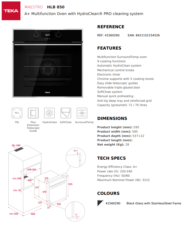 TEKA HLB 850 BLACK 70L MULTIFUNCTION BUILT-IN OVEN WITH HYDROCLEAN PRO CLEANING SYSTEM