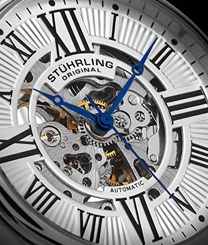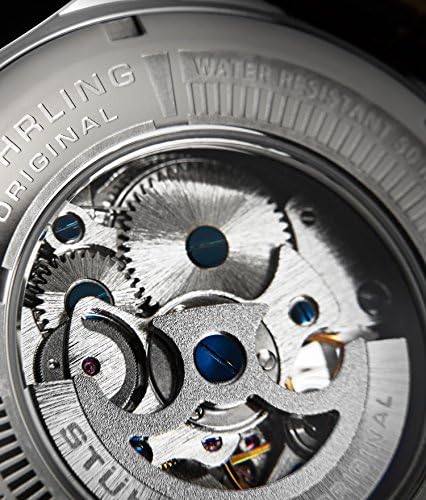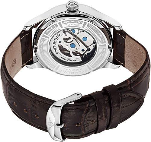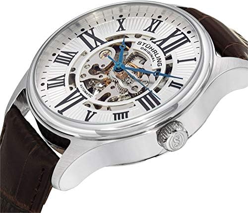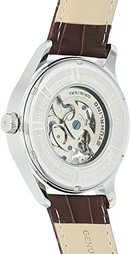 Stainless steel round shaped case with polished beveled bezel Protective Krysterna crystal on front and back Silver stamped design dial with center skeleton cut out and black printed Roman numerals Brown alligator embossed genuine leather strap with tang buckle Water resistant to 165 feet (50 M): suitable for swimming and showering #3,526,177 in Clothing, Shoes & Jewelry ( ) #19,451 in