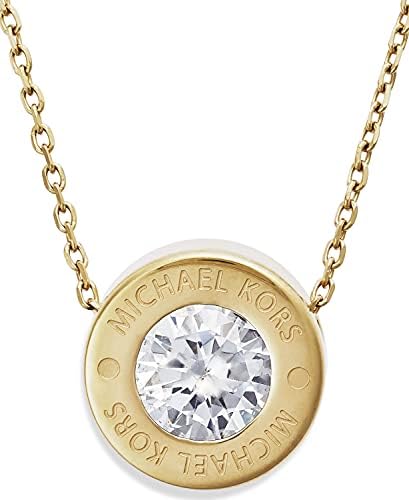 The Michael Kors jewelry collection is designed for timeless appeal. Crafted from hypoallergenic materials like stainless steel and brass with sparkling accents, rich in detail with enduring quality. Perfect as a chic stand-alone piece or for layering, this Michael Kors necklace features a brilliant-cut crystal in a thick, MK logo-engraved bezel pendant setting. The clasp is accented with a drop pendant with the MK logo and an additional crystal. This pendant necklace features gold-tone stainless steel and an adjustable lobster clasp closure. Length 16" + 2" extender Closure: Lobster Clasp Finish: Polished #289,709 in Clothing, Shoes & Jewelry ( ) #3,246 in