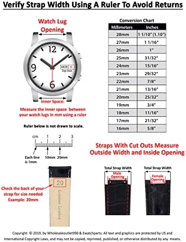 USE A RULER TO MEASURE YOUR STRAP WIDTH OR CASE OPENING IN MM before purchasing to avoid returns as all models vary in size. We have a measurement guide in the image gallery to assist you if needed. BAND MATERIAL: Genuine Italian Leather; BAND WIDTH: 2 mm/ 16 mm; BAND COLOR: Dark Brown; STRAP LENGTH: 115mm ( 4.6 inches) x 75mm ( 3 inches); GENERIC replacement watch part - NO markings or logo #8,451,613 in Clothing, Shoes & Jewelry ( ) #12,077 in