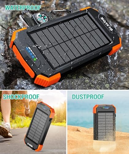 Brand-Oriented & Outdoor Charger Pro: With over ten years of experience in solar power banks, BLAVOR has already gained the favor and trust of millions of global users. BLAVOR only uses the highest-grade materials, to provide the most reliable and safe products to customers. Leading USB C Input&Output Tech and Qi Wireless: 5V 2.4A output, 50% faster-charging speed, and zero damage to your devices. Support charging 3 devices simultaneously, multiple output/input methods, freeing your worries of a power outage. Compatible with almost all smart devices, such as iPhone, ipad, Samsung, etc. Premium Battery & Smallest Solar Charger: BLAVOR uses the safer Lithium-cobalt battery, which is 50% more cycling times than a normal Li-polymer battery. The smallest and lightest portable charger on the market, real-rated 10,000mAh. When fully charged, it can charge the iPhone8 3.6 times, iPhone14pro 2.2 times, and the iPad Air once. Safe Material and Comfortable Design: The outer case is made of flame-retardant ABS+PC materials. The waterproof silicone better protects the internal structure of the charger. Rubber skin-feel oil coating process to form a protective film on the surface, comfortable touch, and exquisite appearance. Multi-Purpose Outdoor Power Bank: BLAVOR portable solar charger is made to be IPX5 waterproof, dustproof and shockproof. The built-in dual super bright flashlights and the included compass carabiner can further ensure your safety when traveling outdoors, making it an ideal companion for outdoor enthusiasts. Industry-leading Warranty: BLAVOR offers considerate and prompt pre-sales and after-sales customer services. We have firm confidence in our products. Any questions, please feel free to contact us, our professional team will give you a satisfactory reply within 24 hours.