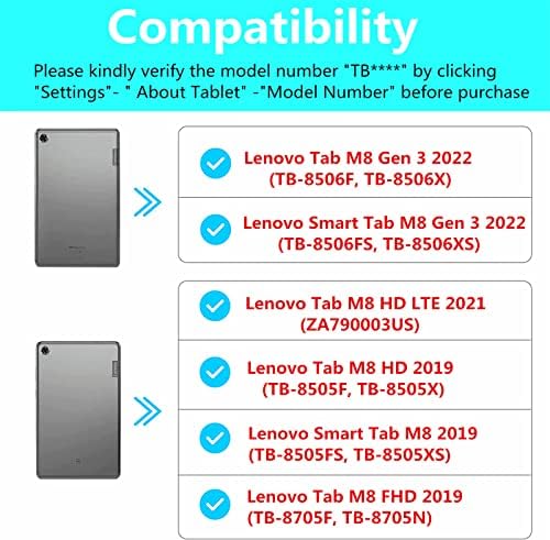 COMPATIBLITY - Case for 8" Lenovo Tab M8 HD LTE 2021 (Model: ZA790003US), Lenovo Tab M8 HD 2019 (Model: TB-8505F TB-8505X), Lenovo Smart Tab M8 (Model: TB-8505FS) 2019 and Lenovo Tab M8 FHD 2019 (Model: TB-8705F TB-8705N) ONLY, Please kindly verify the model number "TB****" by clicking "Settings"- " About Tablet" -" Model Number" before purchase. PREMIUM QUALITY - Made of Ultra Slim Soft Silicon for comfortable sense of touch and durable purpose while provides ultimate protection. PROTECTIVE - Slim design that adds minimum bulk and weight to your device while the case wrap around the edge for protection purpose. STAND COVER - Triple-fold design is super convenient for providing different viewing angles when watching video, texting, gaming or learning etc. PRECISE DATA - Easy Access to All Buttons.Ultra compact and precisely cut to preserve full access to all buttons without taking off the case like charging, listening to music, video etc.