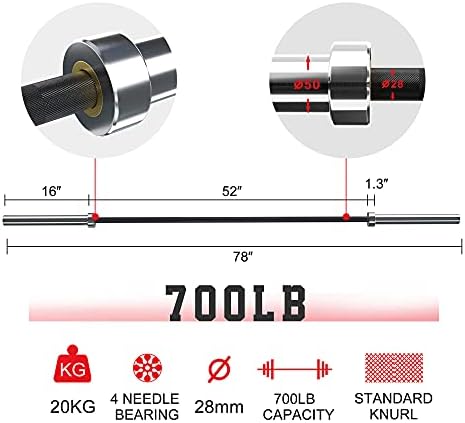 Material: The Olympic barbell is made of 190,000 tensile strength steel, weighs 20kg, can bear a weight of 700lb, and has enough tension to meet various exercise needs. It's a great choice for exercise. Specifications: total length -87in, shaft length (length between sleeves) -52in, sleeve length -16in, handle diameter -28mm, with a 1.2mm diamond knurled design on it to enhance the friction of the hand, Bring a great sense of grasping handshake. Features: The rotating sleeve is equipped with 2 needle roller bearings, and there are 4 needle roller bearings at both ends, which can provide all-round silky rotation to further ensure personal safety during exercise. Uses: An Olympic barbell can exercise multiple parts of the body, and can be used for squats, bench press, shoulder presses and other movement training. It is suitable for commercial or domestic use. Durability: The Olympic barbell is chrome-plated, and its surface has high hardness and good wear resistance. The shaft has a special black material coating, which protects the shaft from sweat and is durable.