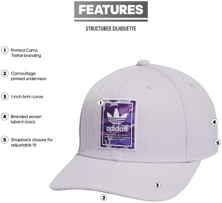 Printed Camo Trefoil branding Camouflage printed undervisor 1-inch brim curve Branded woven label in back Snapback closure for adjustable fit Structured silhouette