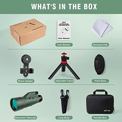 【12x High Power Wide Angle Monocular】12X magnification and 6.5° wide field of view monocular, which provides a more comfortable and larger view, clearer details, adding up to incomparable watching experience. Perfect for Hiking, Camping, Bird watching, Wildlife, Sports, Concerts, Travel, Scenery Watching. 【25mm Large Eyepieces & 56mm Large Objective Lens】 12x56 Monocular is equipped with larger eyepiece and objective lens than ordinary monocular, which secures more light transmission and a brighter and larger field of view. Share the beauty of nature, wildlife at the distance of as far as 325ft/1200 yds with your friends or relatives. 【Large BAK-4 Prism & Premium FMC Lens Coating】Our 12x56 Monocular features advanced Fully Multi-Coating technology and large BAK4 prism lens, to increase the amount of light transmission and reduce unnecessary light reflection, and provide clear, high-contrast, color-accurate images at the same time. Whether you wear glasses or not, this monocular can provide the nice view during your outdoor adventures and you won't be dizzy even after watching for a long time. 【High-quality Smartphone Holder & Tripod】Monocular comes with high quality smartphone holder and sturdy tripod which can be adjusted to two diffrent angles and 3 kinds of length as you like. Professional design, easy to install, ensuring clearer, brighter and shakeless images. Compatilble with all kinds of smartphone. 【Perfect Gift, Satisfactory Service】Comes with a sturdy portable case, made of premium material, it can protect the monocular from shocking, shaking, scratching and maximize its lifespan. Excellent design and portability, perfect GIFT for friends and family. If you are not 100% satisfied with our products, please contact us and you will get the amazing service.