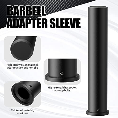 ??FITS OLYMPIC WEIGHT PLATES: A Pair of Olympic 11.8" Adapter Sleeve, Converts 1" Standard Weight Plate Posts to 2" Olympic weight bar or weight post. Great for older style barbells, curl bars, and plate-loaded weight machines. ??WIDE APPLICATION: The outer diameter of this adapter is designed to be exactly 50mm, which matches any 2" Olympic weight board and barbell collar. ??INCLUDING 2PCS BARBELL COLLARS: Providing you with two 2" Olympic barbell clamps, the high quality rubber pads maximize barbell clips grip to ensure your weight plates don't slide or move during your workout or when used on a weight plate rack. ??The Olympic adaptor sleeve features a hexagonal bolt locking feature with metal nuts and hexagonal screws pre-built in so that the slip cord will not be stripped, giving you long-lasting performance and security for your weight storage stakes. Includes hex key. ??HIGH QUALITY MATERIAL: Made of heavy duty and high quality nylon ,End cap is Removable for use with longer 1" standard posts! Includes 2 Allen keys to tighten and loosen the metal hex nut. However, please still refrain from overtightening.