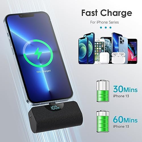 【Small and Ultra-Compact】Size of a lipstick,no need a data cable. It’s easy to slip in your pocket or your purse and incredibly portable. Mini portable charger each one size just is 3x1.5x1.02 inch ; Weight around 100g. 【Portable Plug-in Power Bank】No Need Extra Cables for Charging iPhone,the built-in interface allows you to charge your iPhone anytime, anywhere, without having to carry charging cable with you. Stylish and shiny design makes it elegant and unique. 【Dual Input and Smart LCD Display】Dual Input , You can use your iPhone cable or Type-C Cable(Including Package) to charge this small power bank. Smart LCD digital display can easily track the status of your charge.(Notes: The USB-C charging port support for both input and output.) 【5200mAh Emergency Battery Backup】The mini Power Bank Built-in 5200mAh high-quality Li-polymer battery, most iPhone can be fully charged at least once, which is very suitable as a backup power supply for daily use. As an emergency battery pack,it is great combination of the size and capacity. 【Mini Potable Charger Designed for iPhone Series 】Portable iPhone charger is widely compatible with iPhone 14, iPhone 14 Pro, 14 Pro Max,iPhone 13, iPhone 13 Pro, iPhone 13 Pro Max, iPhone 13 Mini, iPhone 12, iPhone 12 Pro, iPhone 12 Pro Max, iPhone 12 Mini, iPhone 11, iPhone 11 Pro, iPhone 11 Pro Max, iPhone XR, iPhone 8, iPhone 8 Plus, iPhone X, iPhone 7, iPhone 7 Plus, iPhone XS Max, iPhone XS, iPhone Se, iPhone 6s, and also other iPhones etc. 【36 Months Support Services 】5200mAh mini power bank x 2 , USB C cable x 2, user manual x 1. AND 36 months warranty policy and 24 hours friendly customer service. easy-to-reach support! Any question, please kindly contact us. 【Important Tips !! 】This small portable charger is compatible with phone case thickness less than 4MM. If your phone case thickness is beyond 4MM, the charging port can not plug into charging slot, you need to remove your phone case.