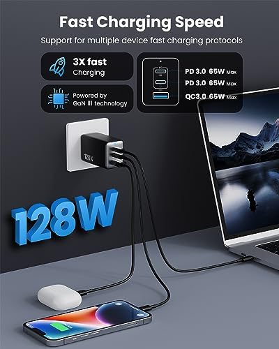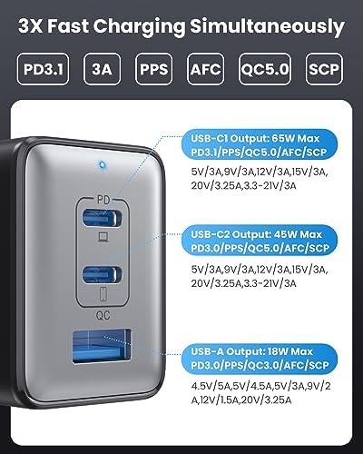 【Newly Upgraded 3-in-1 Charger】Pxwaxpy Multi-function USB wall charger power supplies an input voltage of 100-240 volts. The charging station includes 2 USB-C ports and 1 USB-A ports to charge multiple devices, such as laptops, cellular phones,tablets,headphones, smartwatches, Swtich etc. (PS:When multiple devices are connected, the charger needs to select the correct fast charging protocol and will disconnect 2-3 times before entering fast charging as a safety measure.) 【Efficient Charging & Wide Compatibility】This 3 Port GaN III charger is able to charge 1 laptops and 2 smartphones/tablets at the same time. All ports support (quick charge) agreement, it’s compatible for MacBook Pro/Air, iPhone 15, iPhone 14 or previous models, iPad Pro/Air, Galaxy S10 or previous models, Google Pixel, Dell XPS, Switch, and more. 【Latest GAN III Chip Technology】 The USB C charger adopted GaN III generation chip technology, built-in multi-protection system and premium microchips. With higher energy efficiency and upgraded heat dissipation, Gallium Nitride (GaN) makes our chargers smaller and safer without sacrificing a drop of power. Built-in overcharge protection, overheating protection, short circuit protection, over-current protection, over-voltage protection. (Note: Cable is not included) 【Ultra 3X Fast Charging 】Usb c charger deliver the optimal power output to charge different device at full speed. 1.2 hours to fully charge your MacBook Pro 13”, and compatible with all USB-C laptops. Also compatible with Apple 20W PD and Samsung PPS 45W fast charging, charging iPhone 14 to 50% in half an hour, three times faster than the original 5W charger. The size of wall charger is 2.5*1.1*1.5in and a weight of only 5.1 oz, which is 50% smaller than a normal charger. 【Small & Portable Design】Pxwaxpy USB C wall charger only needs 1 plug to keep your electronic multiple devices charged without taking several bulky charger during the journey. The usb charging station with the ultra-compact, round edge design, and foldable prongs for extra portability, and to avoid scratching other objects in your bag. We have complete warranty service if for any reason, just contact us and we will resolve all quality-related issues by replacement or refund.