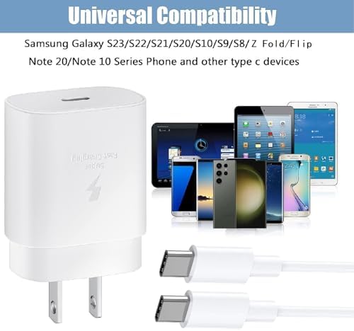 ✅【Safety Super Fast Charger USB-C】25W USB-C PD 3.0 Technology provides Max 25W output power for all Galaxy S24/S23/S22/S21/S20/Ultra/Plus/FE/Z Fold/Z Flip/Note 20/Note 10/Galaxy Tab A7/A8/S7/S8/S9,Fast Charge Your battery from zero up to 100% in about 60 min,5 times as fast as Standard Charger Block,10 times as fast as PC USB port and saves you time. ✅【Safeguard Protection】Match safety standard to advoid over-load, short current and overheat.Continuous high-power output will have a temperature rise, but they are all within the safety limits of standard certification. ✅【Super Fast Charger Compatibility】The USB C fast wall charger cable kit supports most of most of USB C devices, including Galaxy S24,S24+,S24 Ultra,S23,S23+,S23 Ultra,S23 FE,S22,S22+,S22 Ultra,S21,S21 Ultra,S21+,S21 FE,S20,S20+,S20 Ultra,S20 FE,Z Fold 2/3/4/5,Z Flip 2/3/4/5,S10,S10e,S10 Plus,S9,S9+,S8,S8+,Note 10,Note 10+,Note 20,Note 20 UltraA54,A53,A52,A51,A50,A13,A14,Google Pixel,Pixel 2,Pixel 3,Pixel 4,Pixel 5L,Pixel 6,Pixel 7,Pixel 8,LG G7 ,LG G8,LG G6,LG G5 and more USB-C devices. ✅【6.6 Ft Type C Charger Cable Cord】6.6 feet extra length USB Type C fast charging cable,designed for fast charging and data transfer, meet different demand in your daily life. it also easy for charging on different occasion, for travel, home, car, office, etc. ✅【Package List】1-Pack PD 25W USB-C Wall Charger Block & 1-Pack 6.6FT USB-C to USB-C Fast Charging Cable.