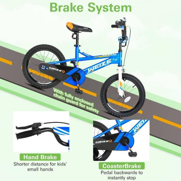 【Size Recommend】: 18" bike for 5-10 years (42"-52") boys & girls. Note: Measure kid’s INSEAM and compare with SADDLE HEIGHT to check if the rider can touch the ground. 【PERFECT FOR BEGINNERS】: Our bicycle are engineered specifically for a kid's proportions, smaller grips, and lightweight frame create an easier ride and control. 【Protected】: Easy to operate handbrake, which is suitable for small kids who don’t have enough power to control brake by hand. In the meantime,the full coverage chain guard to protect little hands, feet, and clothingand provide a safer pedaling environment. 【Durable Wheels & Sturdy Frame】: Made of premium high carbon Steel to survive the bumps of learning. Anti-slip tires and detachable training wheels ensure steadiness and are helpful for beginners to practice balance. 【EASY TO INSTALL】: The children bike comes with 85% Pre-assembled body and the basic assembly tools.You can watch the assembly video on our page first before splicing bicycles.