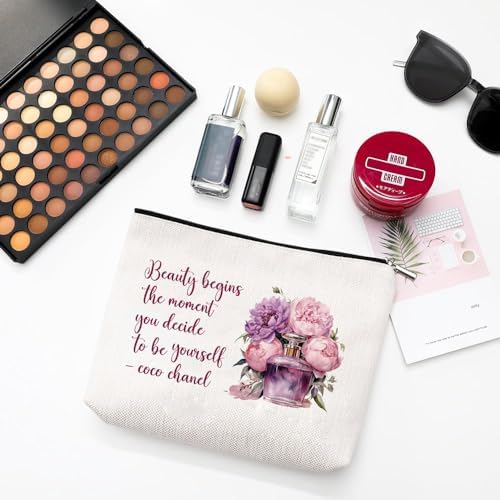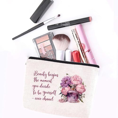 Coco Chanel Quotes Makeup Bag,Fashion Gift for Gilrs, Perfume Flower Beauty Begins The Moment You Decide To Be Yourself- Cosmetic Bag Waterproof Linen Toiletry Beauty Bag Travel Accessories Pouch