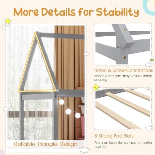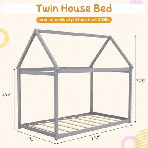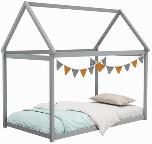 [Unique House Bed Shape]: Our twin house bed frame features a charming, Montessori-inspired house shape design that adds a touch of whimsy and imagination to any child’s bedroom. You can hang curtains, lights or other ornaments to make the house bed look even more fancy and attractive. [Great Transition for Kids]: The floor tent bed will be a good transition from kids to normal bed for young age kids. The low to ground height makes it easy for kids to get in or off the bed, helping them cultivating independence and confidence. [Premium Wooden Frame]: Made from high-quality solid wood and sturdy plywood, this twin bed frame is built to last, providing a long-lasting sleeping environment for your child. The smoothly-polished surface is burr-free for a safe touch. [Versatile Use]: The platform bed with canopy is not only a cozy place to sleep, but also a versatile piece of furniture that can be used as a reading nook, play space, or even a fort. It is a good choice for both boys and girls. [Easy Assembly]: With clear instructions and all necessary hardware included, setting up this toddler bed is a breeze, saving you time and effort. It can accommodate a 6-inch twin size mattress directly. No box spring is required!