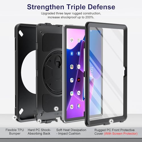 Miesherk Case for Lenovo Tab M10 Plus 3rd Gen: Military Grade Shockproof Case for Lenovo Tablet M10 Plus 10.6" TB-125F/TB-128F with Screen Protector-Rotating Stand-Hand/Shoulder Strap-Black