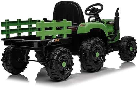 Ride on Tractor w/Trailer, 12v Battery-Powered Toy Tractor w/Remote Control and 3 Speed Adjustable, Electric Car for Kids w/Power Display, USB, LED Lights, Audio, Safety Belt, Army Green