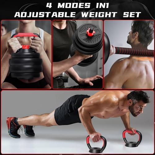 ▶【Versatile Training Equipment】: 4 in 1 adjustable dumbbell set can elevate your home workouts. Ingeniously designed to convert into dumbbells, barbells, kettlebells, and push-up stands, it's the ultimate versatile equipment for a wide array of strength exercises. ▶【Innovative Design】: The unique plates prevent rolling, enhancing safety and allowing for seamless transitions between exercises. This design ensures your workout space is efficient, and your routine is uninterrupted. ▶【Premium Quality & Durability】: Crafted with eco-friendly PE material and a robust cement and iron sand mixture, the 4 in 1 adjustable weight dumbbell set promises durability and precise weight for a focused workout session every time. ▶【Ergonomic Comfort & Secure Grip】: The dumbbells adjustable weight set is designed for a non-slip, secure grip and comfort that adapts to the natural contours of your hands and neck because of it's an ergonomic, foam-padded bar and upgraded anti-loosing nuts design. ▶【Adjustable Weight for Progressives Training】: It is great for diverse exercises and progressives training, ensuring your fitness evolves. Cater to your fitness level with our adjustable weights, dumbbell: 5-44lbs, barbell: 5-88lbs, kettlebell: 2.5-26lbs.